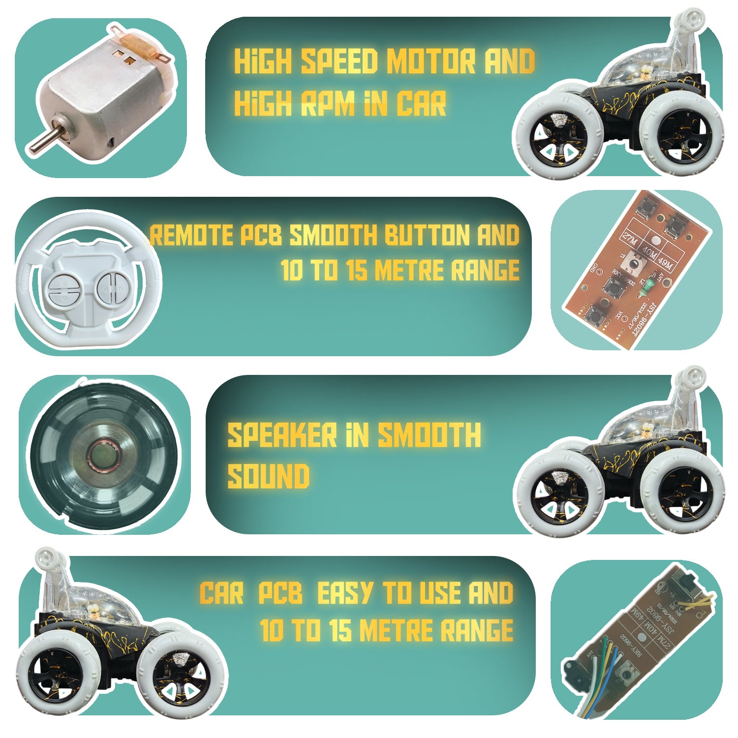 Its matte black body gives a powerful, stealth-style appearance, while the rechargeable battery system supports repeated stunt runs without stopping. Designed for balance and control, this car helps kids experiment with movement, timing, and direction in a fun way.
