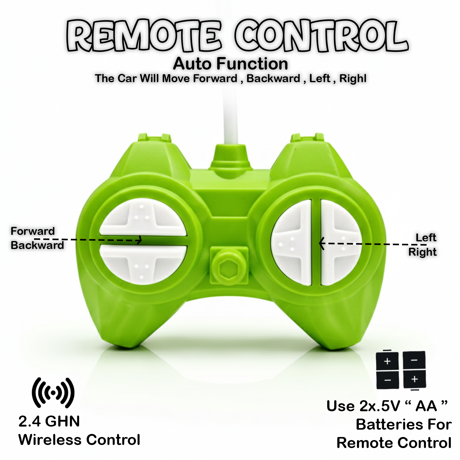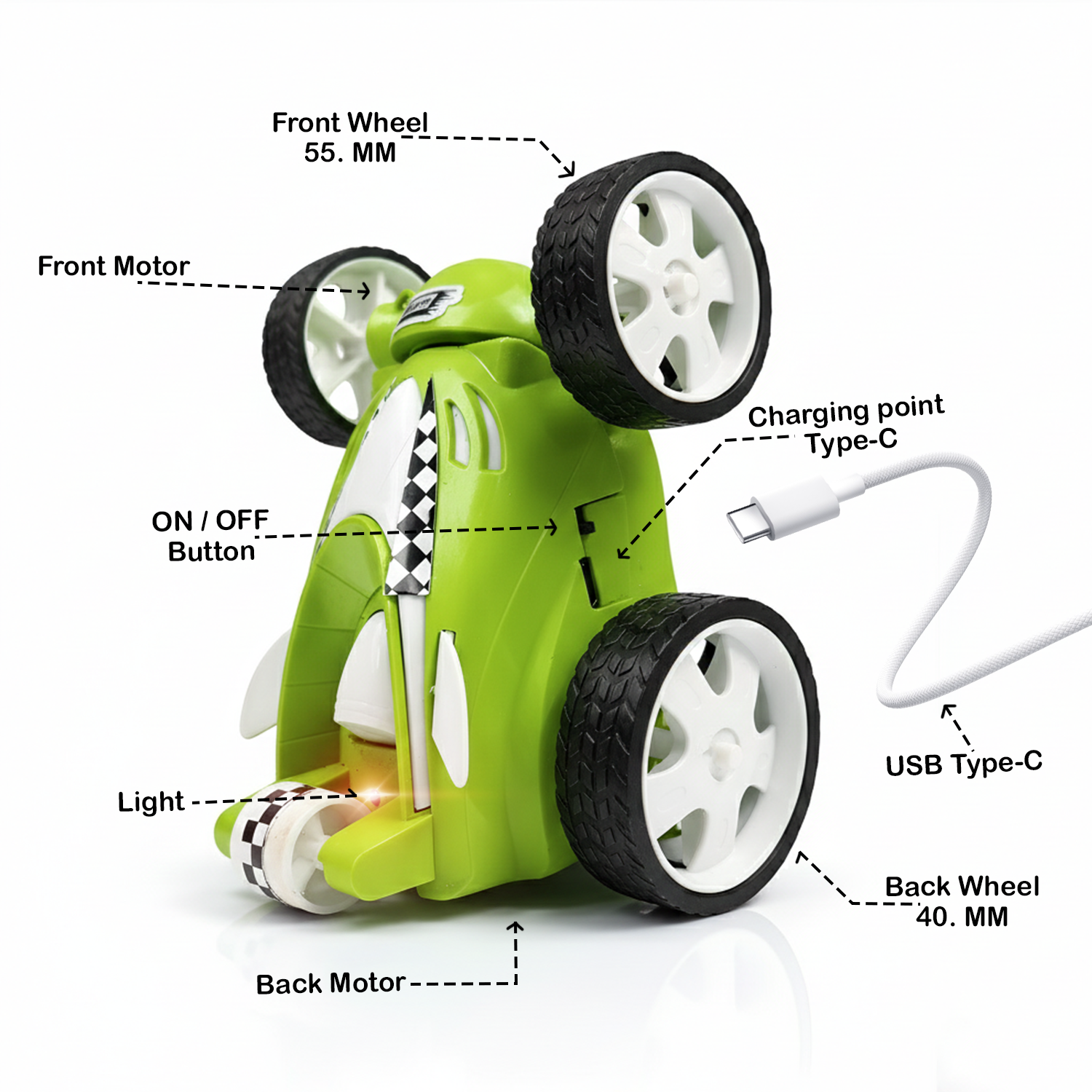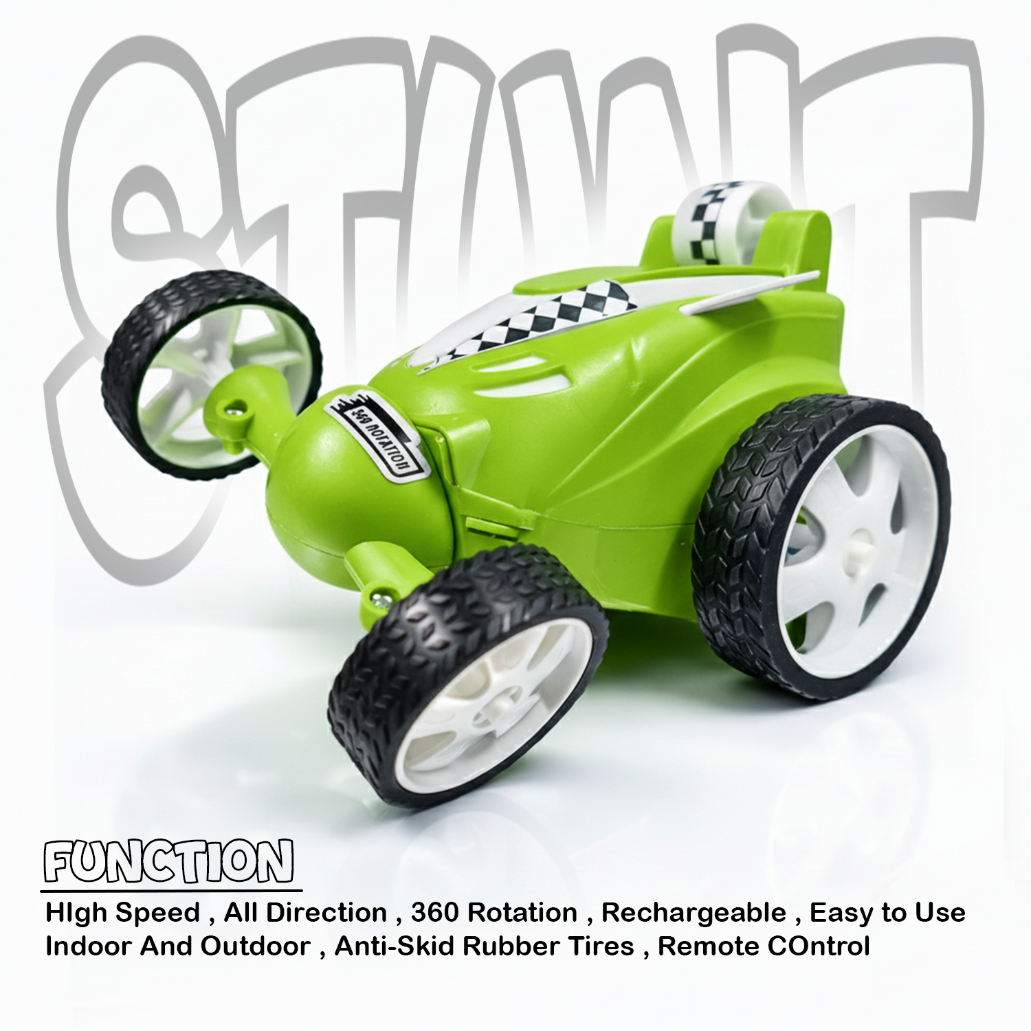 The green body gives a sporty feel, while LED lights add excitement during movement. Powered by a rechargeable battery, this RC car supports repeated stunt sessions and helps kids improve hand-eye coordination and control through active play.