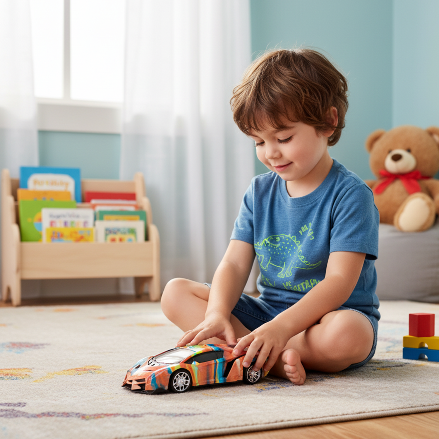 The Model 2030 Sports Car in Vibrant Orange is crafted with a balanced, symmetric body design that gives it a bold and sporty presence. The bright orange color adds energy to playtime, making it a favorite for kids who enjoy fast-looking racer toys.